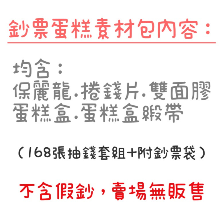 三層168張鈔票 抽錢盒保麗龍 / 20cm / 25cm,捲錢片21/28/31 張 (使用Ø 2.5cm),鈔票袋86張,蛋糕盒38.5*40