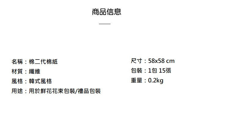 ⚠️本賣場有另售『單張』專區⚠️如需少量購買的可以到單張專區選購唷~~~▪️尺寸:58 x58cm / 1包(15張)▪️材質:纖維布 手感:輕柔因超商包裹尺寸限制,所以出貨時會對折,介意者可以選擇宅配唷~超商重量限制5kg,包裝紙限購「5包」▪️可放使用於禮品包裝、花束包裝 使用之包裝紙🎁