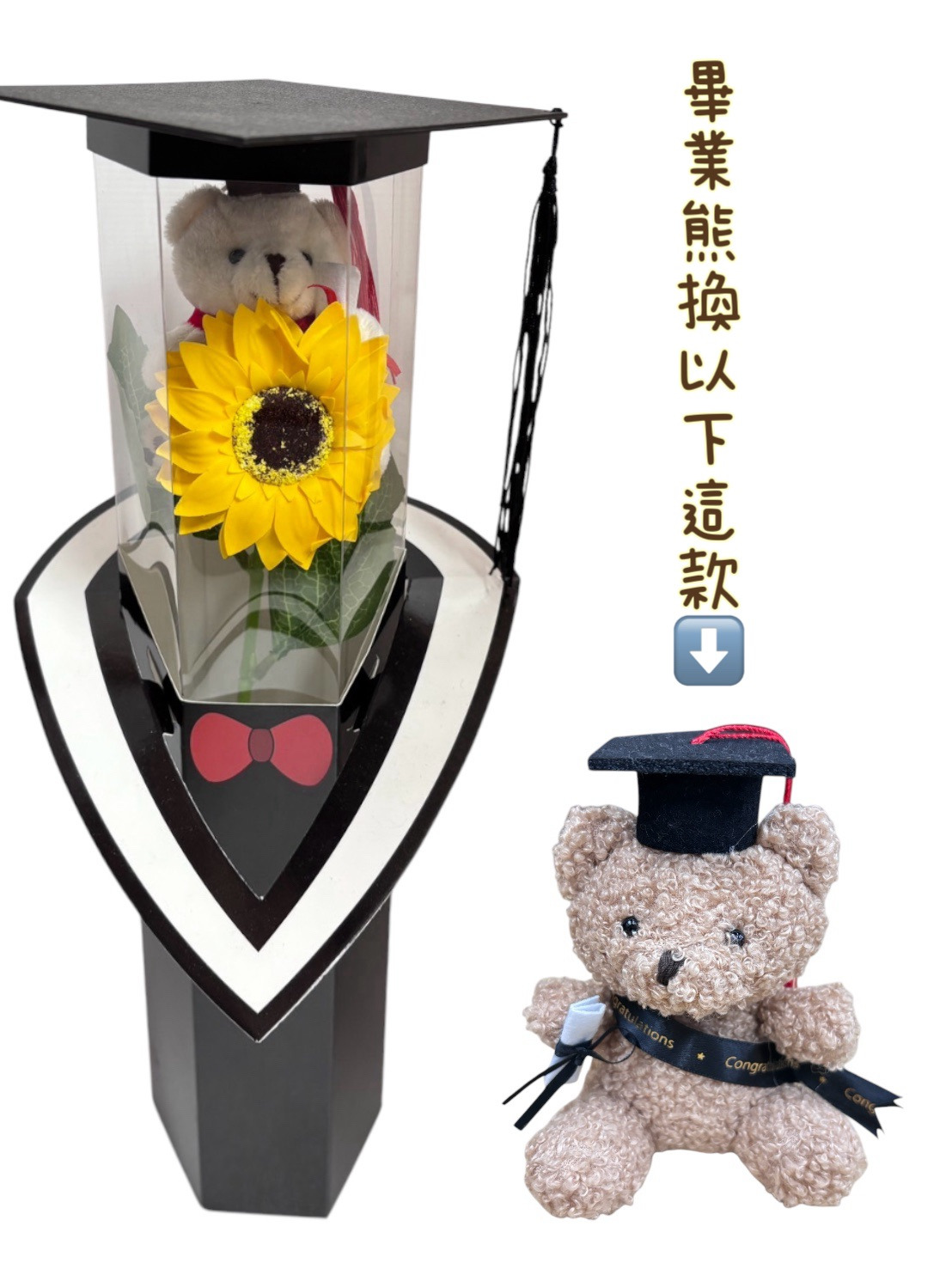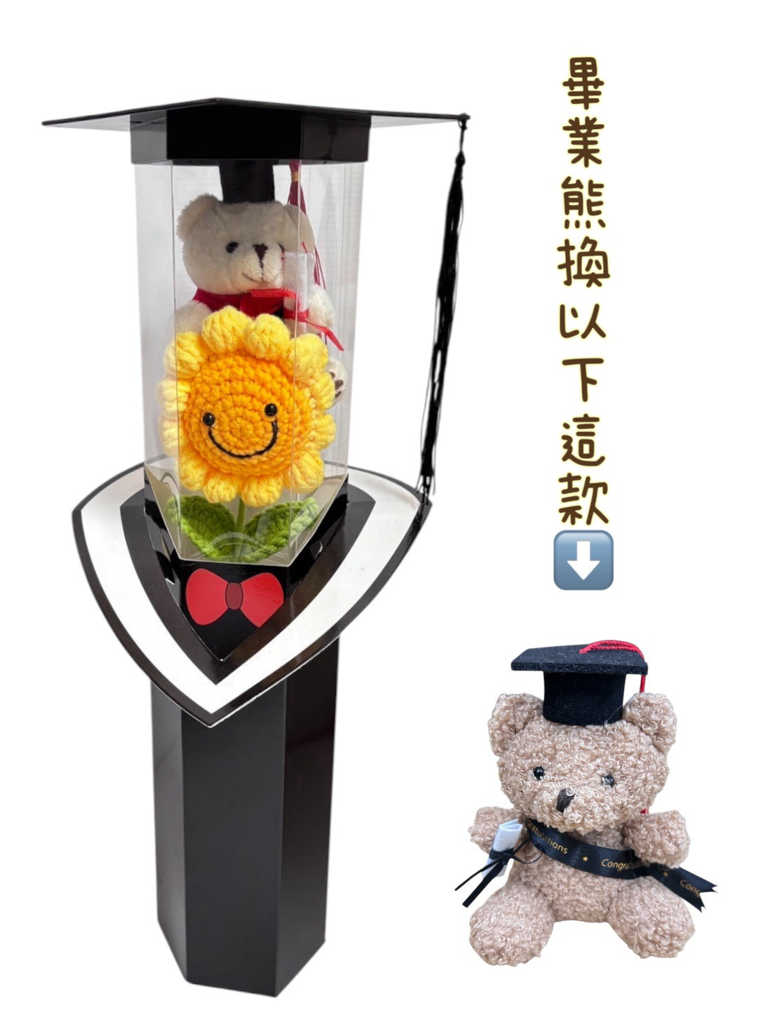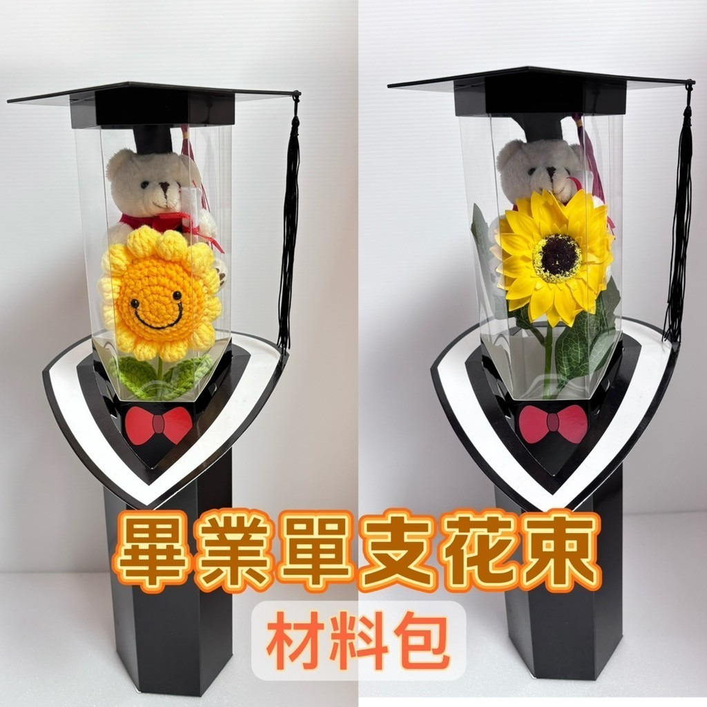 商品尺寸:對角10cm+總高約45公分畢業單支花束(笑臉向日葵)商品配件:盒體+ 透明pvc+領巾+學士帽蓋(塑料材質)+針織笑臉向日葵+畢業熊(顏色隨機)畢業單支花束(向日葵香皂花)商品配件:盒體+ 透明pvc+領巾+學士帽蓋(塑料材質)+向日葵香皂花黃色+花桿(2葉)+畢業熊(顏色隨機)